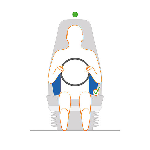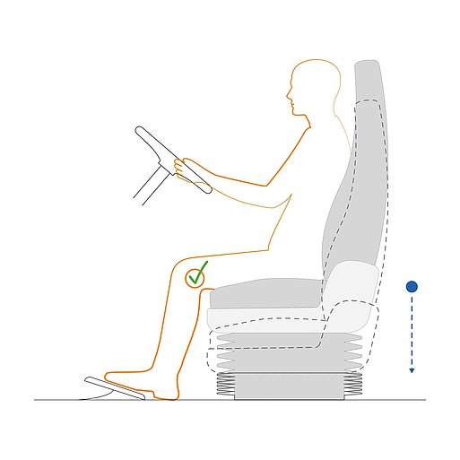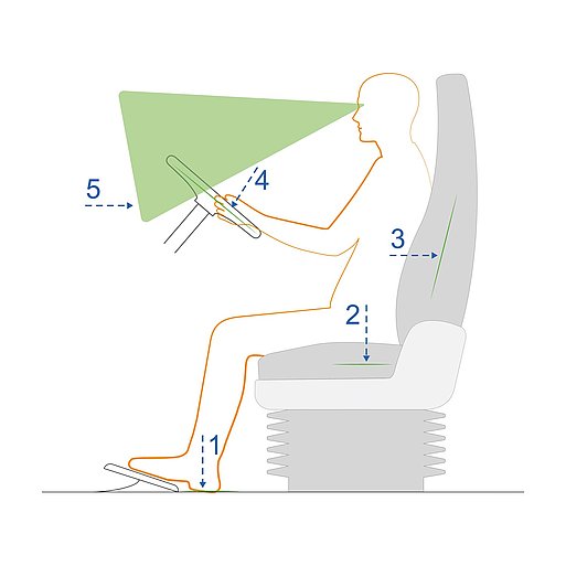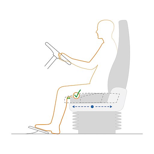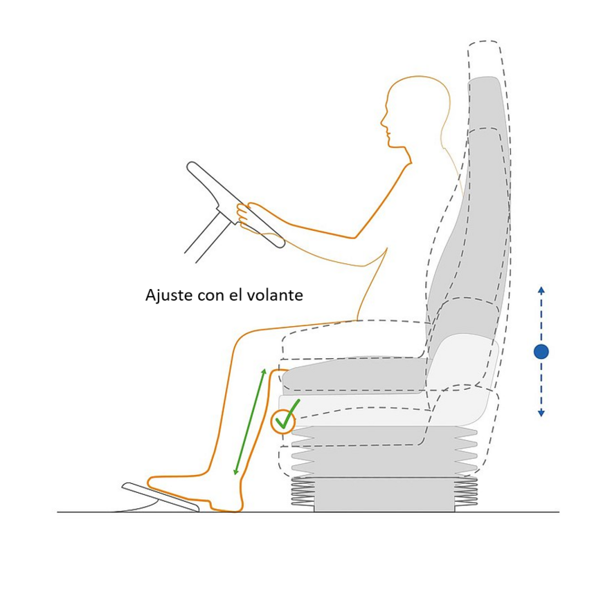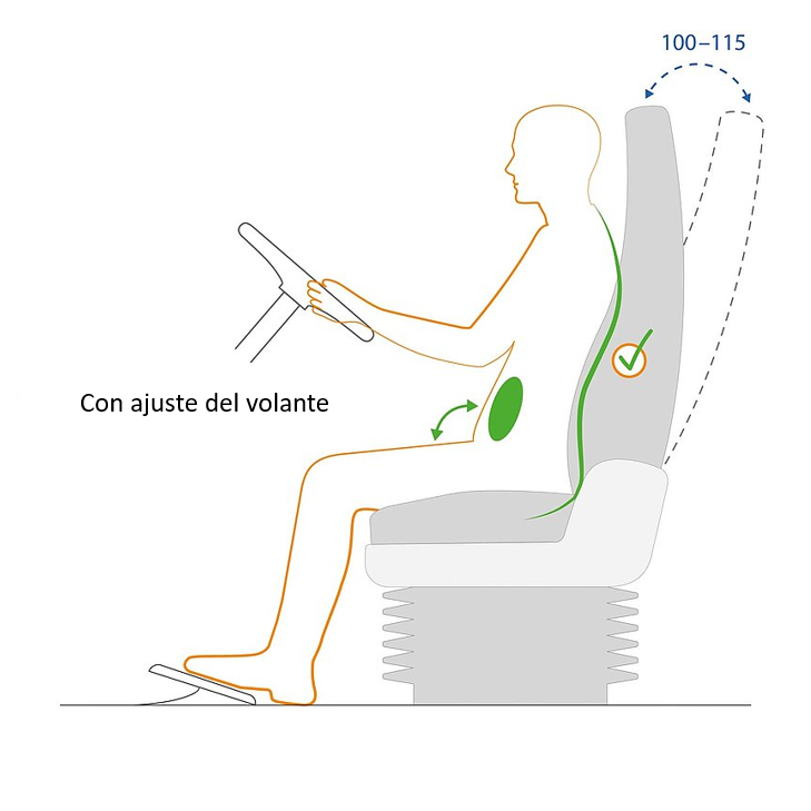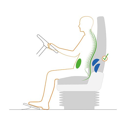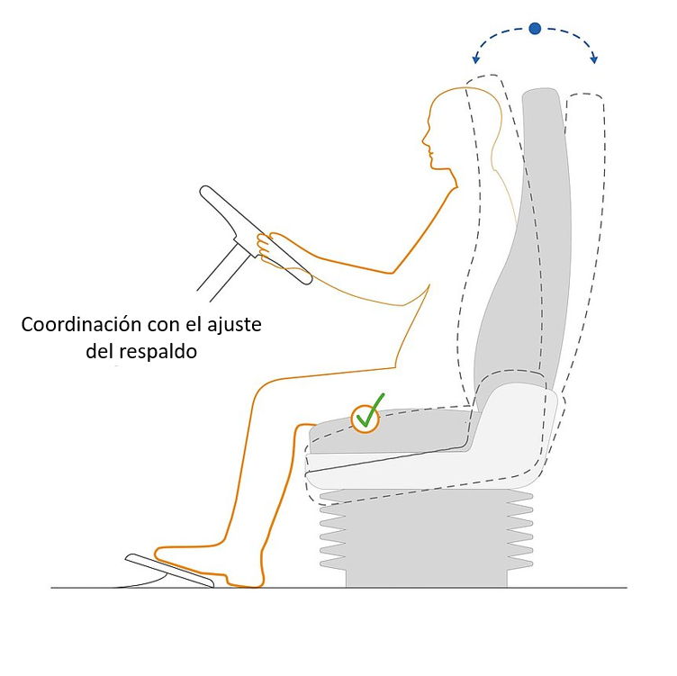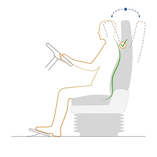 Una buena postura al sentarse es esencial para estar atento tanto a los controles como al tráfico. Sin embargo, también puede dar lugar a dolencias debido a una postura al sentarse continuamente encorvada. Es especialmente importante modificar conscientemente la postura sentada, incluso durante la conducción, ajustando el respaldo o la inclinación del cojín del asiento.